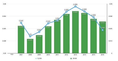 財(cái)報(bào)顯示,自2014年起,全食的凈利率、毛利率開始雙雙持續(xù)性走低,營(yíng)收增長(zhǎng)乏力。2016年,公司錄得收入157.24億美元,同比僅增2.17%,創(chuàng)下了7年新低,凈利潤(rùn)5.07億美元,同比下降5.4%。