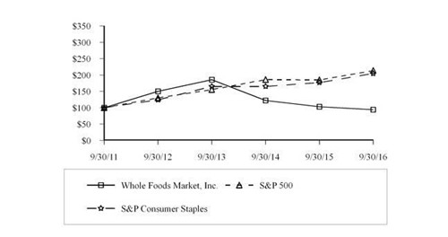 對(duì)于這般業(yè)績(jī),股東們顯然也是不太滿意,最直接的表現(xiàn)是13年之后,全食的股價(jià)再也沒能跑贏大盤,且一路走低。