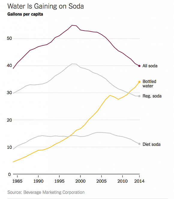 1960年代到1990年代,汽水公司經(jīng)歷過銷售量猛漲。而過去二十年里,汽水在美國(guó)的銷量暴跌了將近25%。而行業(yè)調(diào)研機(jī)構(gòu)Beverage Digest最新數(shù)據(jù)顯示,美國(guó)汽水2016年的銷量滑入了近31年來(lái)的最低谷,較去年銷量又降低了0.8%。