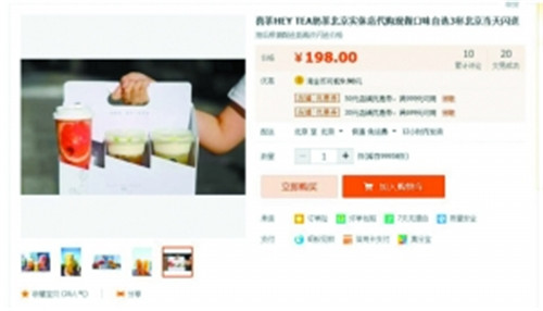 “炎熱的夏季,喜茶?排隊(duì)?我們可以免去你所有不必要的麻煩,你只需要坐在家里等著喝就好了!喜茶代購(gòu)!”、“喜茶HEY TEA奶茶北京實(shí)體店代購(gòu),現(xiàn)做,口味自選3杯,北京當(dāng)天閃送”……此類(lèi)喜茶代購(gòu)宣傳語(yǔ)在貼吧、微博、淘寶等各種網(wǎng)絡(luò)空間上不難找到,排長(zhǎng)隊(duì)的喜茶總是伴隨著黃牛代購(gòu)。