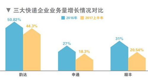 根據(jù)順豐發(fā)布的財報顯示,2017年上半年,順豐控股實現(xiàn)快件業(yè)務(wù)量13.73億件,同比增長20.54%;2016年順豐快件業(yè)務(wù)量為25.8億件,同比增長31%。而申通快遞2017年半年業(yè)務(wù)量為17.26億件,同比增長18.3%;2016年業(yè)務(wù)量近32.6億件,同比增長約27%。此外,韻達(dá)2017年上半年財報數(shù)據(jù)也顯示,業(yè)務(wù)量同比增長44.28%;相比2016年公司業(yè)務(wù)量50.82%的增幅有所減緩。