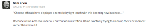 網(wǎng)友Sam Ervin:“‘中國官員對蓬勃發(fā)展的共享單車業(yè)務(wù)表現(xiàn)出柔性的監(jiān)管姿態(tài)。’跟美國不一樣,中國正在積極地改善環(huán)境,而不是破壞環(huán)境。”