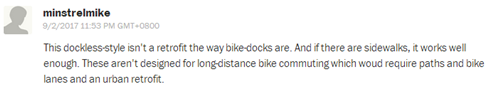 網(wǎng)友minstrelmike:“無樁式共享單車不適合遠距離的騎行者,解決這個問題還得靠自行車道的規(guī)劃和城市的改造。”