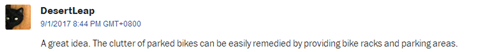 網(wǎng)友DesertLeap:“共享單車是好主意。擔心自行車停放引發(fā)混亂,可以增加自行車架和停車場?!?/font>