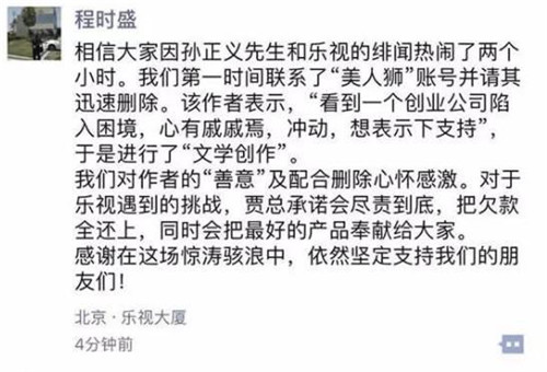 程時盛在朋友圈中寫到:相信大家因?qū)O正義先生和樂視的緋聞熱鬧了兩個小時。我們第一時間聯(lián)系了“美人獅”賬號并請其迅速刪除。該作者表示,“看到一個創(chuàng)業(yè)公司陷入困境,心有戚戚焉,沖動,想表示下支持”,于是進行了“文學創(chuàng)作”。我們對作者的“善意”及配合刪除心懷感激。對于樂視遇到的挑戰(zhàn),賈總承諾會盡責到底,把欠款全還上,同時會把最好的產(chǎn)品奉獻給大家。感謝在這場驚濤駭浪中,依然堅定支持我們的朋友們!