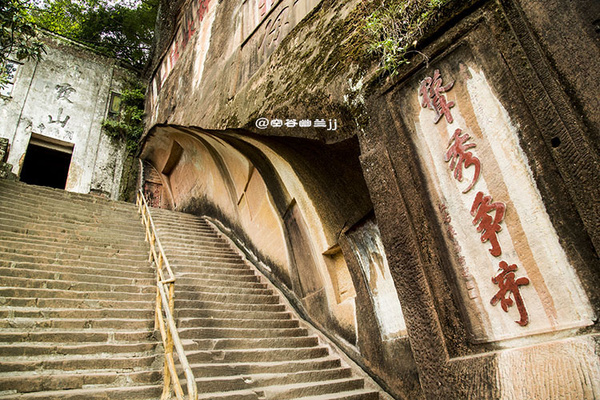 丹梯鐵鎖位于中層風(fēng)景區(qū)至山頂?shù)膽已虑捅谏希陆印昂粑ㄌ臁?。原中層到上層,本無道路可通,后來經(jīng)人工在這里開鑿石階,旁邊輔以鐵鎖鏈,方成通道,并以“丹梯”命名。