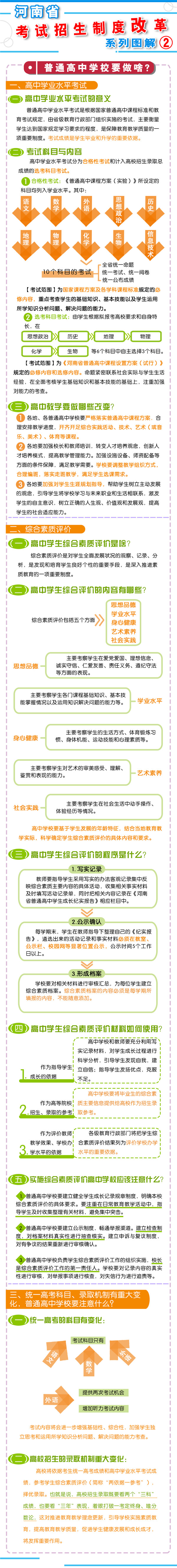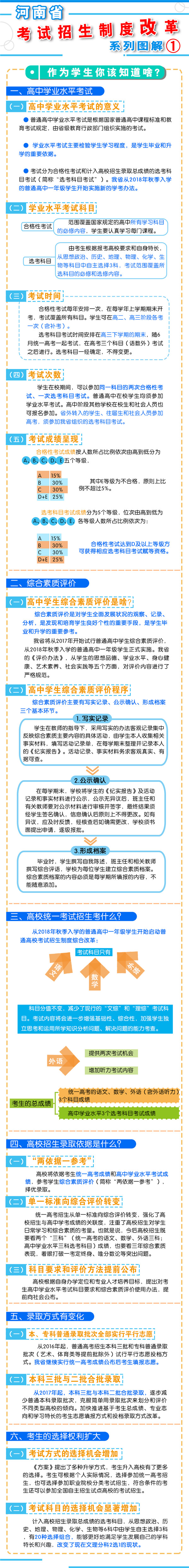 一、促進升學機會公平 逐步增加我省考生接受優(yōu)質(zhì)高等教育的機會,逐步增加農(nóng)村學生升入重點高校人數(shù),減少和規(guī)范高考加分,完善中小學招生辦法?! ?strong>二、改革考試形式和內(nèi)容 完善高中學業(yè)水平考試??荚嚪譃楹细裥钥荚嚭陀嬋敫咝U猩浫】偝煽兊倪x考科目考試(簡稱“選考科目考試”)。合格性考試范圍覆蓋國家規(guī)定的高中所有學習科目的必修內(nèi)容。選考科目由考生根據(jù)報考高校要求和自身特長,從思想政治、歷史、地理、物理、化學、生物等科目中自主選擇3科。學生在校期間,可以參加同一科目的兩次合格性考試、一次選考科目考試?! ∵M一步規(guī)范高中學生綜合素質(zhì)評價。建立全省規(guī)范統(tǒng)一的高中學生綜合素質(zhì)檔案,完善學生綜合素質(zhì)評價電子化管理平臺,客觀記錄學生成長過程中的真實表現(xiàn),確保程序嚴格、公開透明、內(nèi)容真實可信?! ⊥七M高職院校分類考試。高職院校(含高等??茖W校)考試招生與普通高校相對分開,實行“文化素質(zhì)+職業(yè)技能”評價方式。中職(含技校)畢業(yè)生報考高職院校,參加文化基礎(chǔ)和專業(yè)技能相結(jié)合的測試。普通高中畢業(yè)生報考高職院校,參加職業(yè)適應(yīng)性測試,文化素質(zhì)成績使用高中學業(yè)水平考試成績,參考綜合素質(zhì)評價?! ∩罨荚噧?nèi)容改革。依據(jù)國家高中課程標準和高校人才選拔、培養(yǎng)要求,科學設(shè)計命題內(nèi)容,增強基礎(chǔ)性、綜合性,突出能力、創(chuàng)新導(dǎo)向,著重考察學生獨立思考和運用所學知識分析問題、解決問題的能力?! ?strong>三、改革招生錄取機制 完善招生選拔機制。高校要合理確定考試招生的標準、條件、程序等內(nèi)容,在招生章程中詳細列明并提前向社會公布。要加強學校招生委員會建設(shè),充分發(fā)揮其在重大招生事項中的作用。建立考試錄取申訴機制和招生問責制,校長對錄取結(jié)果負責?! 「母镤浫》绞?。從2017年起,本科三批與本科二批合批錄取,逐步減少普通本科錄取批次,克服簡單用錄取批次來劃分和評價不同類型高校的傾向。加快推進基于考生總成績、專業(yè)志向和學習特長的考生志愿填報方式和投檔錄取方式改革?! ?strong>四、改革監(jiān)督管理機制 加強信息公開,全面實施高校招生“陽光工程”,進一步擴大信息公開的范圍和內(nèi)容。強化考試安全,堅持從嚴治考,完善考試招生誠信制度,落實誠信結(jié)果使用要求。加大違規(guī)查處力度,加強考試招生全程監(jiān)管,嚴厲打擊和嚴肅查處考試招生中的違法違規(guī)行為,及時公布查處結(jié)果,嚴格責任追究?! ?strong>五、2018年秋季開始實施 從2018年秋季入學的普通高中一年級學生開始啟動普通高??荚囌猩贫染C合改革。 在改革考試科目設(shè)置上,不分文理科,外語科目提供兩次考試機會。考生的總成績由統(tǒng)一高考的語文、數(shù)學、外語(含外語聽力)3個科目成績和高中學業(yè)水平3個選考科目考試成績組成。保持統(tǒng)一高考的語文、數(shù)學、外語分值不變?! ≡诟母镎猩浫C制上,推進基于統(tǒng)一高考成績和高中學業(yè)水平考試成績、參考學生綜合素質(zhì)評價的多元錄取機制改革。高校要根據(jù)自身辦學定位和專業(yè)人才培養(yǎng)目標,提出對考生高中學業(yè)水平考試科目要求和綜合素質(zhì)評價使用辦法,提前向社會公布。 2016年省教育行政部門出臺普通高中學業(yè)水平考試實施辦法和普通高中學生綜合素質(zhì)評價實施辦法,從2018年秋季入學的普通高中一年級學生開始正式實施?! ?strong>省教育廳文件通知: 1、關(guān)于印發(fā)《河南省普通高中學業(yè)水平考試實施辦法(試行)》的通知 2、關(guān)于印發(fā)《河南省普通高中學生綜合素質(zhì)評價實施辦法(試行)》的通知