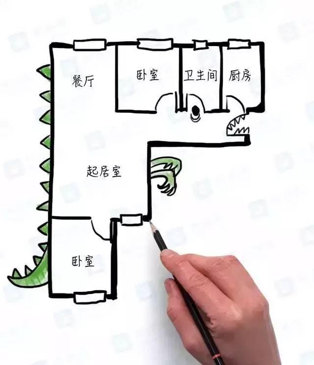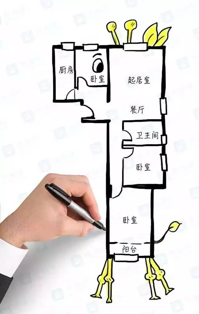 2、這是一個(gè)狹長(zhǎng)的空間,客廳完全沒(méi)有采光和通風(fēng),整個(gè)屋子都亮不起來(lái),兩件臥室橫框整個(gè)房子,如果做兒童房還真不太方便。