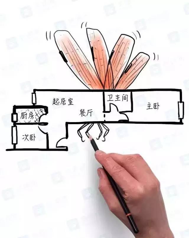 3、客廳有采光,但是房間旁的過(guò)道又長(zhǎng)又窄,臥室在最盡頭,光線完全照不過(guò)去,衛(wèi)生間沒(méi)有窗戶(hù),又和廚房一起堵在過(guò)道處,味道一定不好聞。