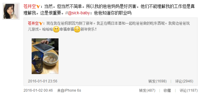 隨后有網(wǎng)友留言,問及“你爸爸知道你職業(yè)嗎?”蒼井空很是坦誠回答:“當(dāng)然。但當(dāng)然不簡單。所以我的爸爸媽媽是好厲害。他們不能理解我的工作但是真理解我。這是很重要?!备芯W(wǎng)友敏感地問道:“蒼老師的父親也看過她的作品嗎?”蒼井空反問“如果你爸爸的話怎么樣”讓網(wǎng)友為其機(jī)智點贊。