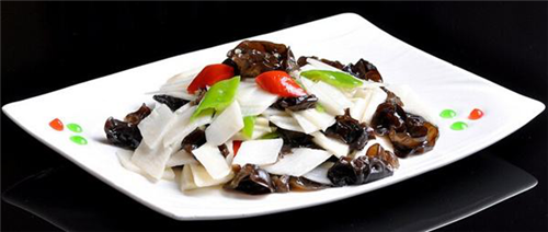 清炒山藥木耳:第一步準備食材,把山藥用火燎掉須根,用工具打去表皮,洗凈切成梯形寸段,焯水30秒撈出投涼,切成菱形片,焯水30秒撈出投涼;然后將木耳摘洗干凈,撕成小塊,焯水1分鐘撈出投涼;準備好蔥姜切絲。第二步:將鍋中加植物油燒熱,下蔥姜絲爆香,倒入蠔油山藥和木耳,烹入料酒,撒上精鹽翻炒均勻,勾薄芡,放味精,淋明油出鍋裝盤即可。