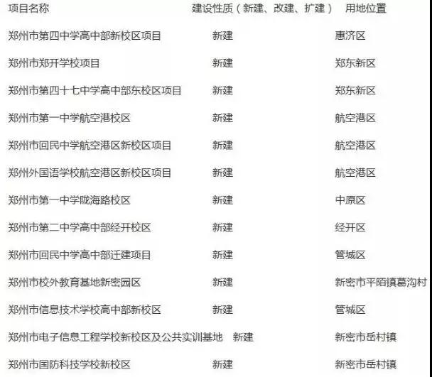 表格中顯示的學(xué)校鄭州一中、鄭州外國語學(xué)校等知名中學(xué)的新校區(qū),家里有孩子該上學(xué)的朋友趕緊看看你家附近有沒有學(xué)校要新建!