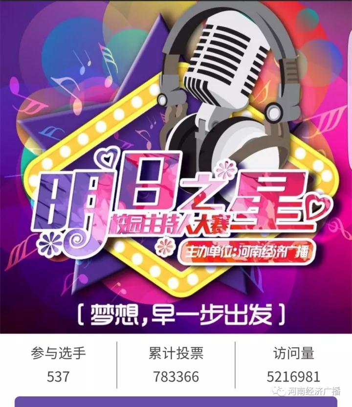 河南經(jīng)濟廣播·第三屆“明日之星”校園主持人大賽備受矚目,微信投票更是達到了五百二十一萬的訪問量!經(jīng)過鄭州、安陽、南陽、三門峽、駐馬店、洛陽、開封、新鄉(xiāng)、商丘、林州、漯河、新鄭,十二個賽區(qū)十四個賽點,二千六百余人的激烈角逐;再到?jīng)Q賽時選手的精彩表現(xiàn)。一路走來,有驚喜、有歡樂、有學(xué)習(xí)、有思考。