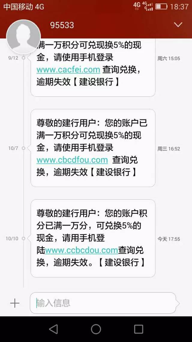 9月24日,受害人尹某,收到來(lái)自95533兌換建行賬戶積分的詐騙短信,點(diǎn)擊釣魚(yú)網(wǎng)站鏈接操作后被轉(zhuǎn)賬騙走5000元。9月28日,受害人盧某,收到95533兌換建行積分詐騙短信,點(diǎn)擊釣魚(yú)網(wǎng)站鏈接操作后被轉(zhuǎn)賬騙走3900元。