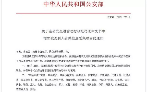2016年7月1日起,機動車駕駛?cè)藢嵤┙煌ㄟ`法行為后,公安交通管理部門在對交通違法作出行政處罰時,被處罰人的政治面貌和職業(yè)信息將被調(diào)查,涉及中共黨員和國家工作人員的將被通報紀(jì)檢監(jiān)察機關(guān)。