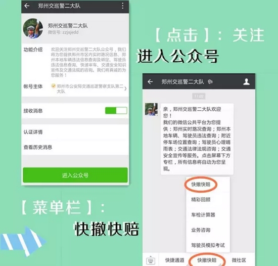 支隊(duì)科研所此次研發(fā)的交通事故快賠快撤功能,跳出了以往單方損失2000元以下的限制,只要在交警二大隊(duì)轄區(qū):嵩山路(含)嵩山路以西區(qū)域及中原區(qū)、西開發(fā)區(qū)全境,公共道路上發(fā)生的兩車事故,車輛能夠正常駕駛,沒(méi)有人員受傷,就可以通過(guò)“鄭州交巡警二大隊(duì)微信公共平臺(tái)”進(jìn)行快撤快賠處理。