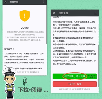 4、適用范圍:交警二大隊(duì)轄區(qū)內(nèi)嵩山路(含)嵩山路以西區(qū)域及中原區(qū)、西開發(fā)區(qū)全境,公共道路上發(fā)生的兩車事故,車輛能夠正常駕駛,沒(méi)有人員受傷,均適用。