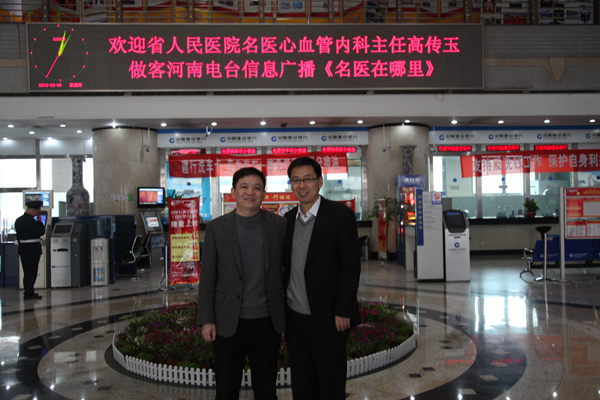 開(kāi)播第一天做客節(jié)目的嘉賓省人民醫(yī)院心血管內(nèi)科主任高傳玉與河南電臺(tái)信息廣播總監(jiān)李金鋒合影