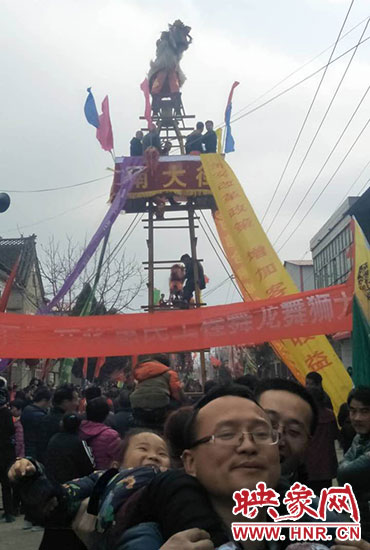 新鄭市觀音寺鎮(zhèn)太清村,新鄭、長葛、禹州的三縣交界處。3月3日下午15時許,太清村的街上人山人海,水泄不通。各條街道上鑼鼓喧天,熱鬧非凡。多個舞獅團隊開始在高高樹起的架子上表演,地面上各種各樣的民間表演爭奇斗艷。