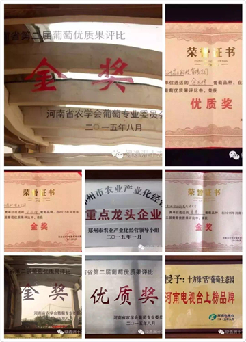2015年由河南省農(nóng)學會葡萄專業(yè)委員會舉辦的河南省第二屆葡萄優(yōu)質(zhì)果評比活動,會上共有來自全省各地的優(yōu)質(zhì)葡萄品種近200個。河南綠逸洲農(nóng)業(yè)科技有限公司十方緣“活”葡萄種植基地選送的優(yōu)質(zhì)葡萄品種夏黑、巨玫瑰分別以85.27和83的總分喜獲金獎;金手指獲得優(yōu)質(zhì)獎。