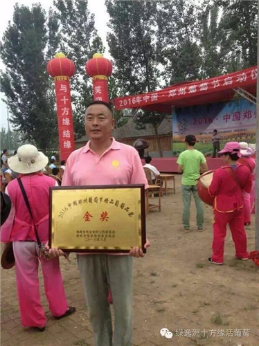 2016年8月5日,由鄭州市農(nóng)業(yè)農(nóng)村工作委員會與鄭州市休閑觀光農(nóng)業(yè)協(xié)會會聯(lián)合舉辦的2016中國鄭州葡萄節(jié)精品葡萄品鑒會,河南緑逸洲農(nóng)業(yè)科技有限公司十方緣“活”葡萄種植基地選送的“自然農(nóng)法”生產(chǎn)的優(yōu)質(zhì)葡萄品種醉金香喜獲金獎。