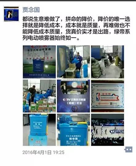 任何一名企業(yè)家,都有困惑的時(shí)候。開始的時(shí)候,生產(chǎn)電動噴霧器的公司也就只有他這一家,如今在河南省內(nèi)達(dá)到了100多家,全國的生產(chǎn)廠家有1000多家,賈總覺得目前市場競爭是比較激烈的,仿造的甚至是假冒的產(chǎn)品還時(shí)有出現(xiàn);產(chǎn)品的利潤也沒有以前高了;隨著原材料及工人工資等成本的增加,批發(fā)價(jià)格也有所調(diào)高;這一點(diǎn),有時(shí)在賈總的微信里也看出了一些無奈和感慨?! ?/p>