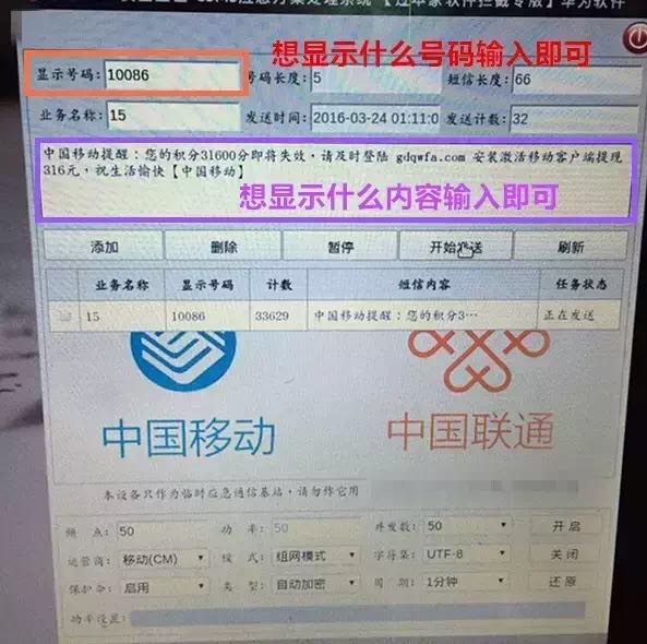 比如,圖中輸入的顯示號碼是10086,內(nèi)容是中國移動提醒的相關(guān)內(nèi)容。那么,騙子編輯好這些以后,我們就可以收到上圖中列舉的移動提醒短信。