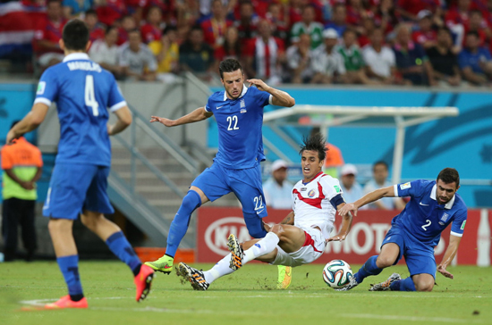 北京時間6月30日4時,世界杯1/8決賽第4場在累西腓伯南布哥球場展開較量,哥斯達(dá)黎加120分鐘與希臘戰(zhàn)為1比1,點(diǎn)球決戰(zhàn)5比3勝出,首次打進(jìn)世界杯8強(qiáng),也成為2002年美國之后首進(jìn)8強(qiáng)的中北美洲球隊(duì),將與荷蘭爭奪半決賽席位。下半場,哥斯達(dá)黎加隊(duì)長魯伊斯打破僵局,但中衛(wèi)杜阿爾特此后兩黃下場。補(bǔ)時階段,帕帕斯塔索普洛斯扳平比分。點(diǎn)球戰(zhàn),哥斯達(dá)黎加門將納瓦斯撲出耶卡斯點(diǎn)球。 【詳情】