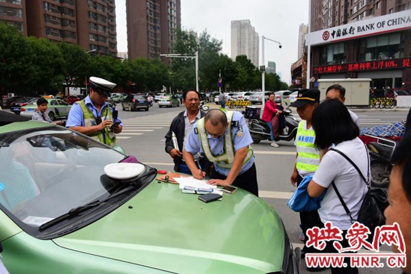 在路口的西南角,停著一輛出租車(chē)。鄭州市交警四大隊(duì)兩名民警正向雙方當(dāng)事人詢(xún)問(wèn)情況。