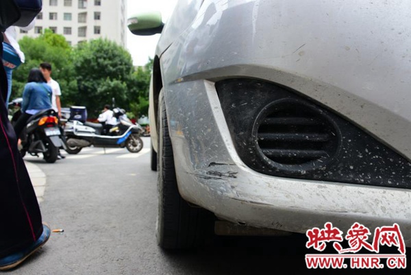 檢查發(fā)現(xiàn),出租車(chē)右前車(chē)輪前的保險(xiǎn)桿上有幾道清晰的刮蹭痕跡,但出租車(chē)司機(jī)否認(rèn)是今天留下的。