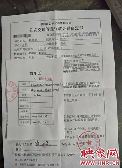 11月2日下午16時(shí)許,偃師市交警大隊(duì)給韓先生開具了公安交通管理行政處罰決定書【2017】410321-2900412916號(hào),處罰900元。韓先生急匆匆去交了900元罰款后,拿了交警隊(duì)的交款單去了交通局,交通局于當(dāng)天晚上17時(shí)30分許,給韓開具放車單。韓去停車場(chǎng)看到自己的車時(shí),已經(jīng)是當(dāng)天晚上20時(shí)以后了。