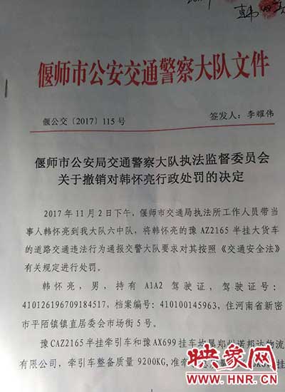 17日下午13時(shí)許,在廣電南路上,法制科黎科長(zhǎng)和督察李警官帶著“偃師市公安局交警大隊(duì)執(zhí)法監(jiān)督委員會(huì)關(guān)于撤銷對(duì)韓懷亮行政處罰的決定”文件與韓先生見面。