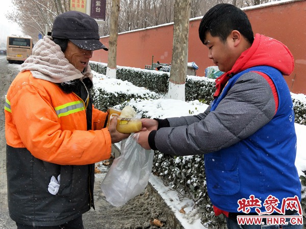 早上開(kāi)車(chē)路過(guò)的二公司79路車(chē)長(zhǎng)張鵬輝看到環(huán)衛(wèi)工奮力除雪的情景,中午下班后悄悄地和同事買(mǎi)了40個(gè)包子和20杯小米粥驅(qū)車(chē)到文化路北四環(huán)送到環(huán)衛(wèi)工手中。