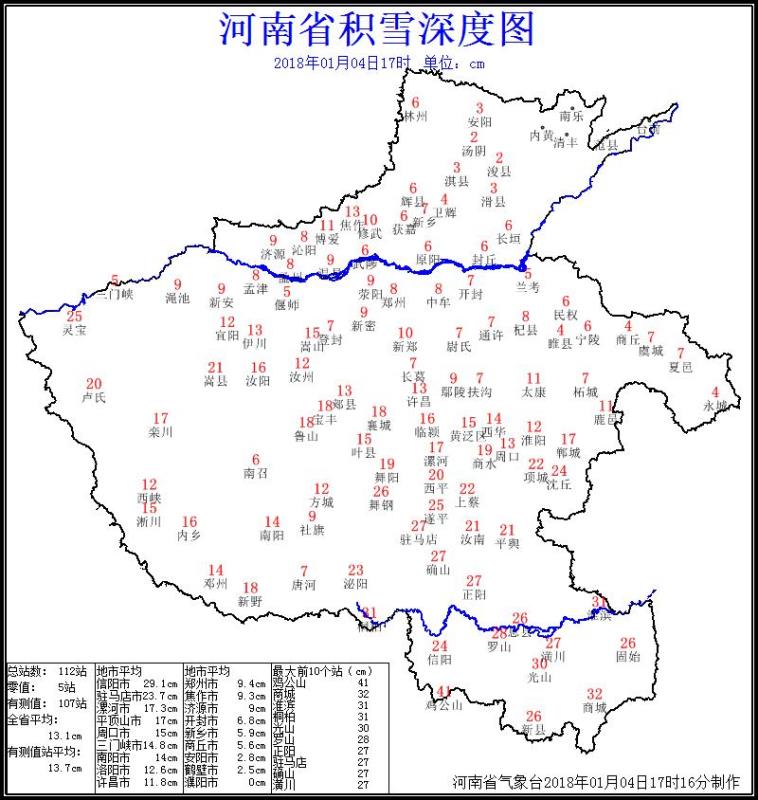 截至4日17時(shí),除東北部外,全省大部的積雪深度普遍在5厘米以上,信陽(yáng)、駐馬店、南陽(yáng)、漯河、平頂山、周口、三門(mén)峽、洛陽(yáng)、許昌和焦作大部積雪深度在10厘米以上,信陽(yáng)、駐馬店和周口南部積雪深度多在20厘米以上,最大積雪深度出現(xiàn)在雞公山41厘米(見(jiàn)積雪深度附圖)。