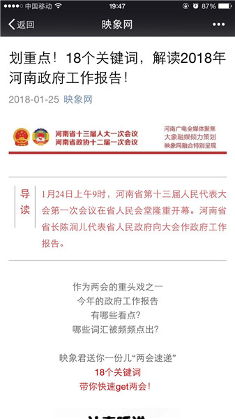 映象網(wǎng)官方微信策劃推出原創(chuàng)策劃《河南人,2018給你穩(wěn)穩(wěn)的幸福!》、《你好,我是河南!這是我的五年成績單,請接收!》、《2018年,河南都有哪些“小目標(biāo)”?》、《劃重點!18個關(guān)鍵詞,解讀2018年河南政府工作報告!》。每篇都刷屏朋友圈,網(wǎng)友積極轉(zhuǎn)發(fā)點贊,稱“看完真的覺著穩(wěn)穩(wěn)的幸福”。