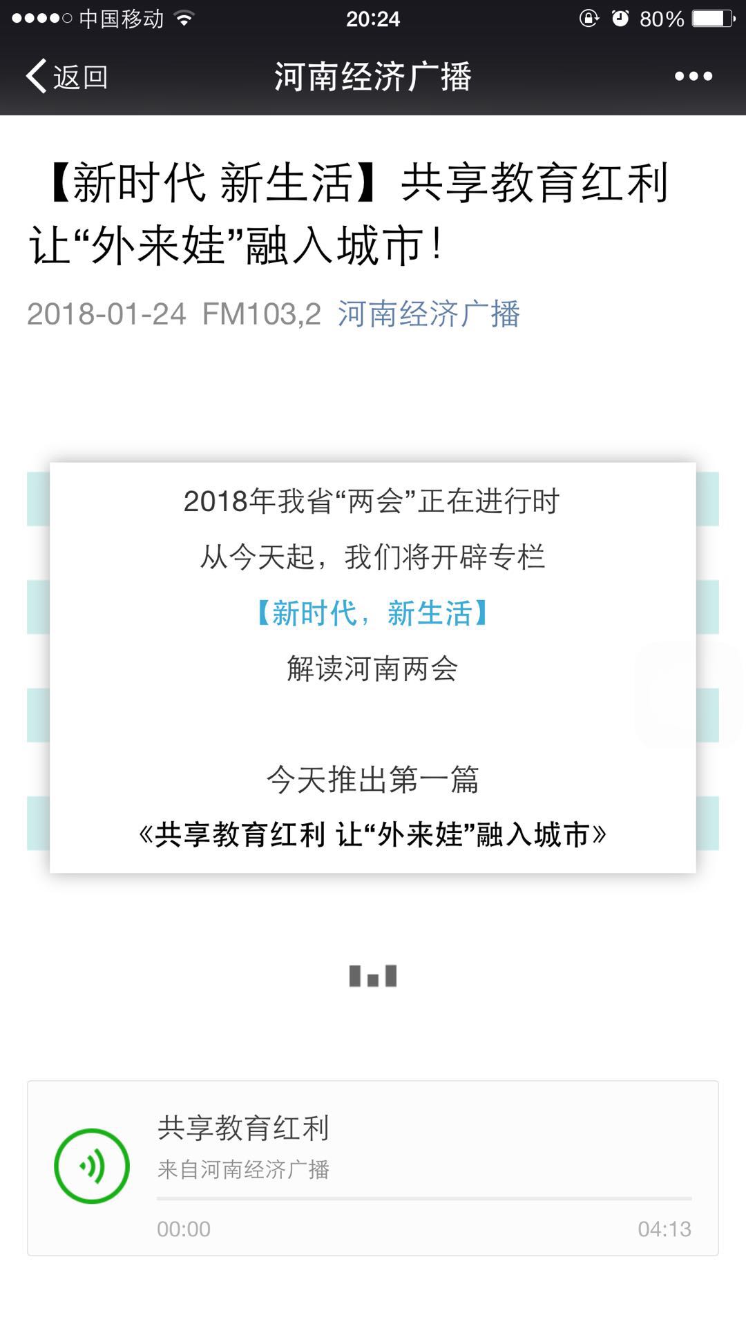 河南經(jīng)濟(jì)廣播推出兩會專欄“新時代 新生活”,推出五篇深度報道:《共享教育紅利 讓“外來娃”融入城市!》、《藍(lán)天白云下的大數(shù)據(jù)“護(hù)衛(wèi)隊”!》、《讓家庭醫(yī)生打通分級診療“最后一公里”》、《加大住房保障力度,圓百姓安居夢!》、《扎根中原大地,“創(chuàng)”出美好未來!》,總時長25分鐘。這一組報道用“講故事說新聞”的方式,關(guān)注隨遷子女享有與城市學(xué)生一樣的高品質(zhì)教育、環(huán)保技術(shù)革新、返鄉(xiāng)下鄉(xiāng)創(chuàng)業(yè)扶貧、保障房建設(shè)、生態(tài)文明等熱點民生話題,每期采訪都做到聲音全面、數(shù)據(jù)詳實、人物典型、立意深遠(yuǎn),通過對代表、委員建議、對話部門、基層聲音等四個方面,對熱點話題報道做到有“廣度 高度 深度 溫度”。
