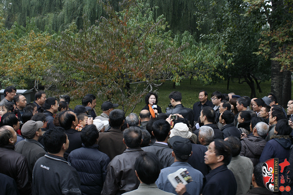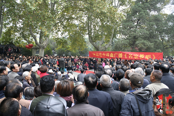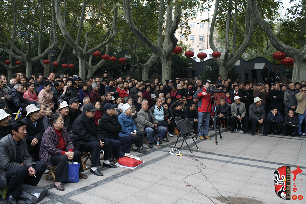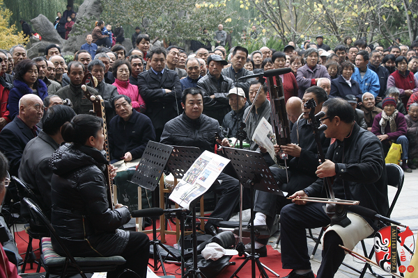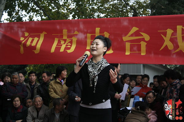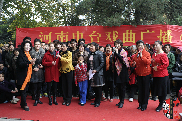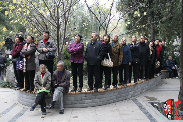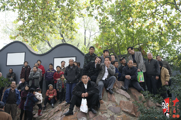 觀眾當(dāng)中,有從廣播中得知消息早早就趕來(lái)的戲迷,也有周末游園駐足的市民。活動(dòng)原計(jì)劃九點(diǎn)半開(kāi)始,在現(xiàn)場(chǎng)戲迷們的熱情要求下,活動(dòng)主辦方之一——鄭州梓軒藝術(shù)團(tuán)的團(tuán)員們九點(diǎn)剛過(guò)便開(kāi)始了暖場(chǎng)演出。 這是一個(gè)由戲迷自發(fā)組織的藝術(shù)團(tuán),他們經(jīng)常在公園演唱,為廣大戲迷所熟悉和喜愛(ài),也為豐富群眾的業(yè)余文化生活做出了很大的貢獻(xiàn)。