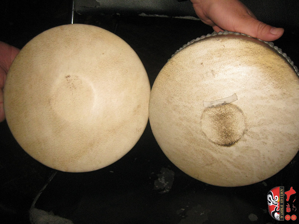 二團(tuán)著名的鼓師石振虎對于板鼓的使用非常講究 左邊是《程嬰救孤》專用的