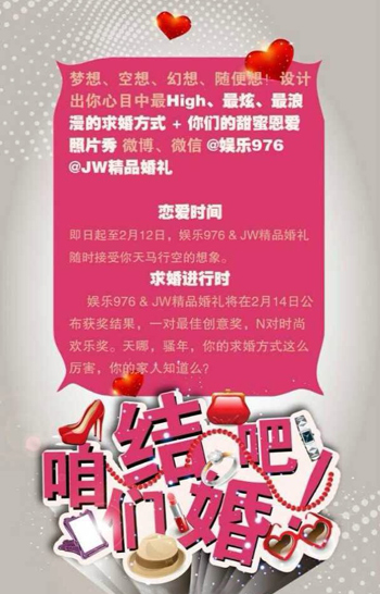 2月12日娛樂976全新上線,我們?yōu)槟蛟煲粓鰪V播史上最時尚最浪漫的求婚派對+結婚盛典!只要心中有愛,求婚方式可以多姿多彩,怎樣的求婚才能讓她難忘、心甘情愿說“I do!”?現在,只要有創(chuàng)意的求婚方式,就可以獲得10萬元求婚+結婚盛典!求婚,你準備好了嗎?咱們結婚吧!