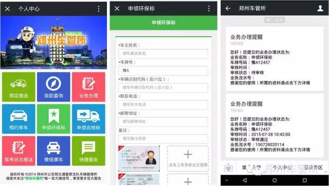 不出家門,也可以領(lǐng)到綠標(biāo)自2015年7月27日起,鄭州車管所聯(lián)合鄭州環(huán)保局在微信公眾平臺推出了“微信申領(lǐng)環(huán)保標(biāo)”的服務(wù),如果您是“6年免檢”車輛的車主,即可通過微信平臺在線申領(lǐng)綠色環(huán)保標(biāo),申領(lǐng)成功后,會有專門的快遞人員送標(biāo)到家。