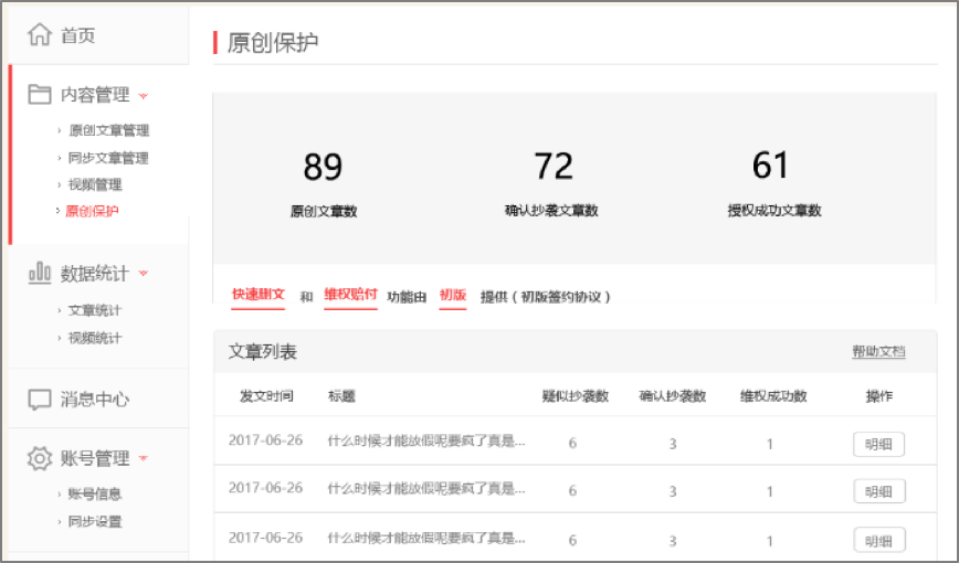 一點號、鳳凰號為自媒體用戶提供原創(chuàng)文章版權(quán)保護功能。 其中,鳳凰號將于月末開啟維權(quán)賠付功能,通過后臺監(jiān)測200+主流平臺,對侵權(quán)抄襲行為一查到底替作者維權(quán)。未來一點號、鳳凰號將會全力打造原創(chuàng)優(yōu)質(zhì)內(nèi)容的版權(quán)保護平臺及監(jiān)測網(wǎng)絡,對于站內(nèi)文章被站外的抄襲也會進行相關(guān)維權(quán)工作。