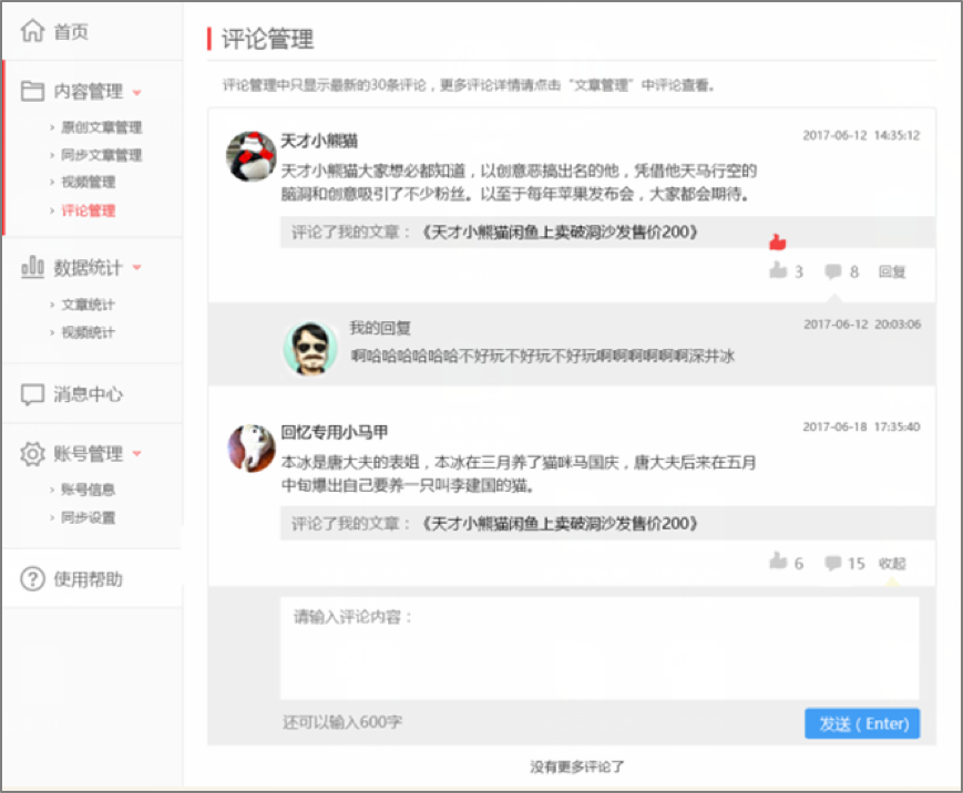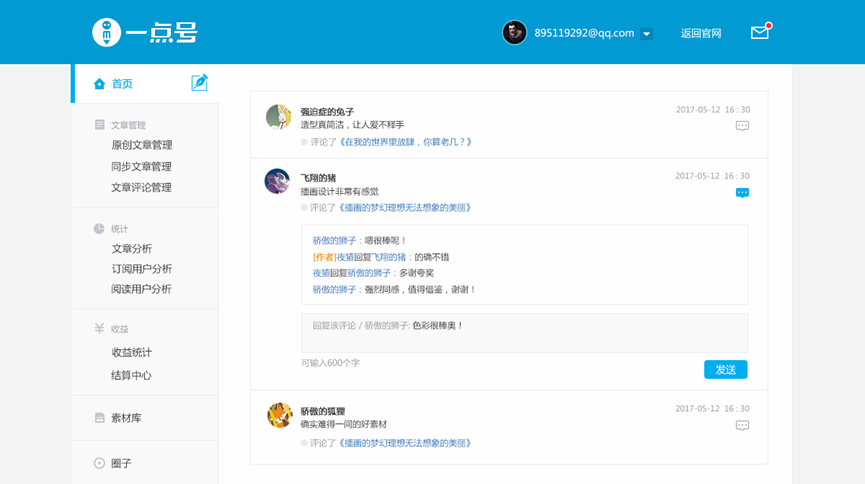 本次積分系統(tǒng)升級之后,一點號、鳳凰號的作者將會更方便快捷的在后臺查看用戶評論,參與用戶討論回復,點贊自己欣賞的讀者評論,能夠更全面更多元化的與讀者進行互動。