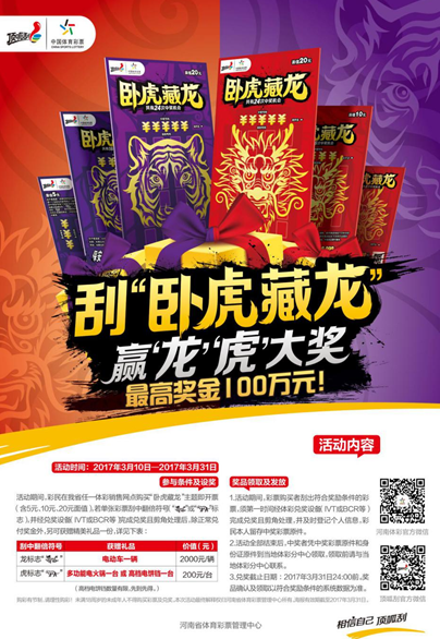 經(jīng)典套票激情會(huì)面,三重好禮重磅活動(dòng),百萬(wàn)獎(jiǎng)金愉悅暢享,盡在體彩“臥虎藏龍”。