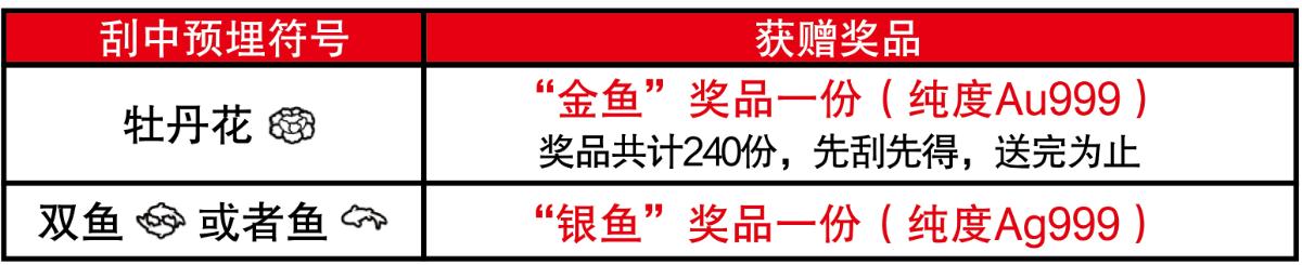 活動期間,彩民在我省任一體彩銷售網(wǎng)點購買30元面值“富貴有余”主題即開票,若單張彩票刮出符合獎勵條件的預(yù)埋符號,并經(jīng)兌獎設(shè)備(IVT或BCR等)完成掃描確認(促銷兌獎)且剪角處理后,即可獲贈精美獎品一份,詳見下表: