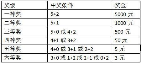 一等獎:投注號碼與“樂善碼”的5個前區(qū)號碼(順序不限,下同)和2個后區(qū)號碼(順序不限,下同)相同,即中獎,獎金為5000元;