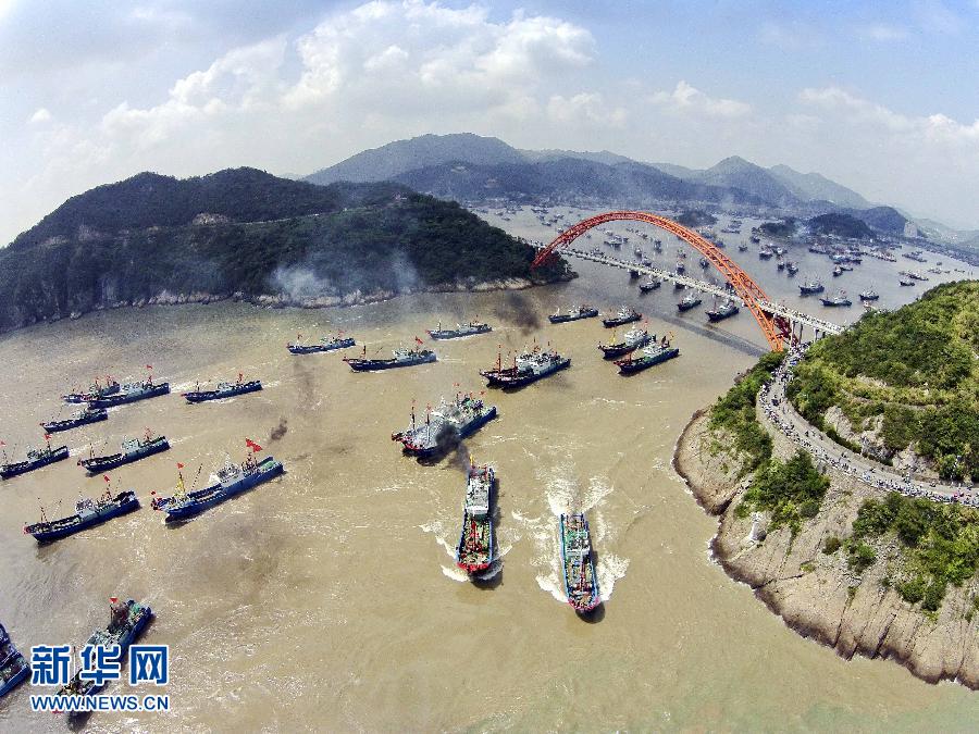 9月16日,浙江省舟山市沈家門漁港的漁船出港經(jīng)過朱家尖大橋開赴漁場。當(dāng)日,為期3個半月的東海伏季休漁結(jié)束,眾多漁船劈波斬浪,開往漁場。   新華社發(fā)(華志波 攝)