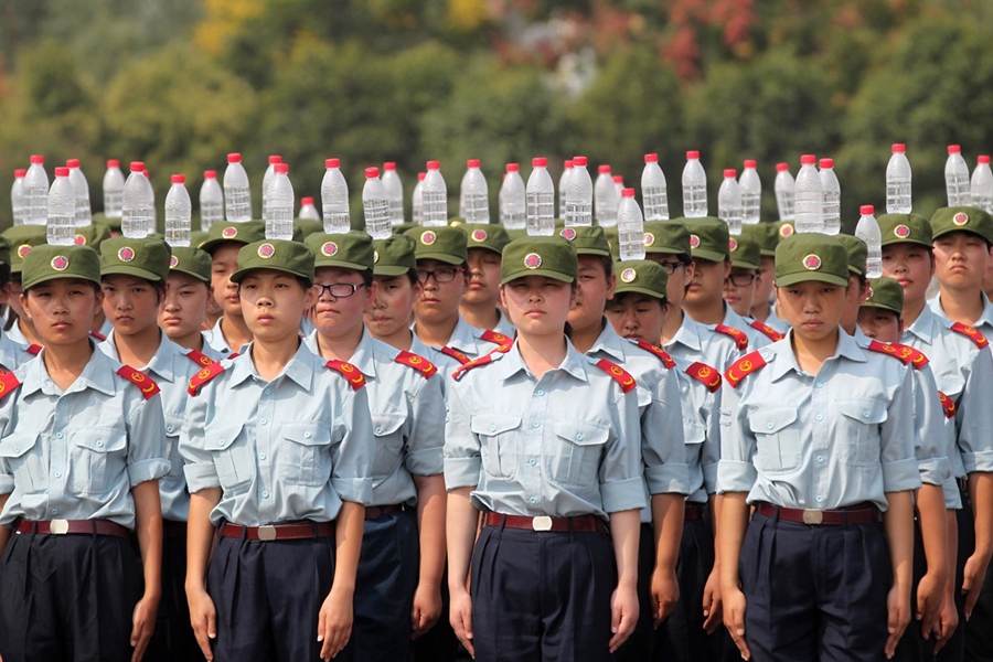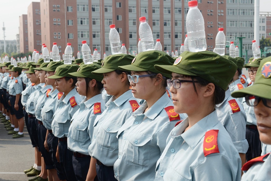 2015年9月17日,河南鄭州航空工業(yè)管理學(xué)院進(jìn)行新生軍訓(xùn),記者軍訓(xùn)現(xiàn)場發(fā)現(xiàn),該院在站軍姿、踢正步等軍訓(xùn)項(xiàng)目上,引入卷尺、純凈水瓶等“裝備”,而且為“準(zhǔn)空姐”訓(xùn)練的科目中,還增加了如何盤發(fā)等項(xiàng)目。圖為2015年9月17日,鄭州航空工業(yè)管理學(xué)院的新生在頭頂?shù)V泉水瓶站軍姿。