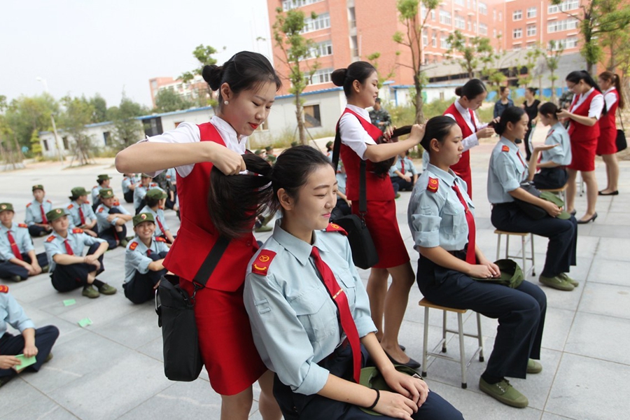 新生們手中都握著一個(gè)礦泉水瓶,這些礦泉水瓶是用來訓(xùn)練站軍姿、齊步走的。當(dāng)教官發(fā)出口令,所有新生立正站好,將水瓶放在頭頂。踢正步時(shí),教官也會(huì)手持卷尺,測量新生腳尖高度是否達(dá)到離地面25公分。而選出將要參加我省高校的閱兵活動(dòng)的空乘班方隊(duì),還增加了如何盤發(fā)、化淡妝等項(xiàng)目的訓(xùn)練。圖為2015年9月17日,鄭州航院的“準(zhǔn)空姐”們正在軍訓(xùn),參加盤發(fā)項(xiàng)目。