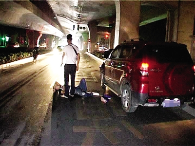 鄭州交警四大隊(duì)民警根據(jù)現(xiàn)場目擊者提供的線索,在距離事故現(xiàn)場約兩公里處找到了肇事的紅色SUV,此時該車逆向停放在貨站街與隴海路交叉口附近的BRT快速公交車道內(nèi)。