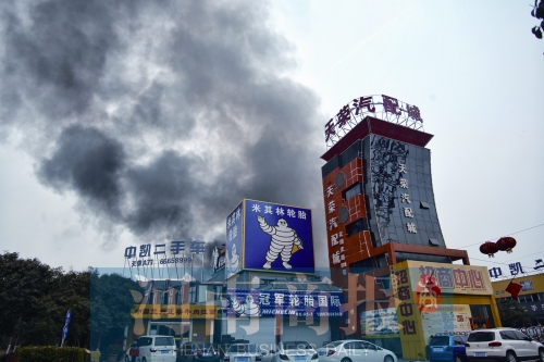 24日下午2時,鄭州花園路與三全路交叉口附近的天榮汽配城里濃煙滾滾。
